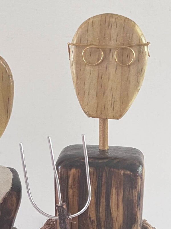 Add a touch of rustic charm to your space with this handcrafted wooden figurine. Inspired by the famous "American Gothic" painting, this unique couple exudes a quaint charm. The man wears wire glasses and holds a small pitchfork, while the woman features a lovely lace-like detail. This figurine is perfect for adding a touch of artistic flair to your space.