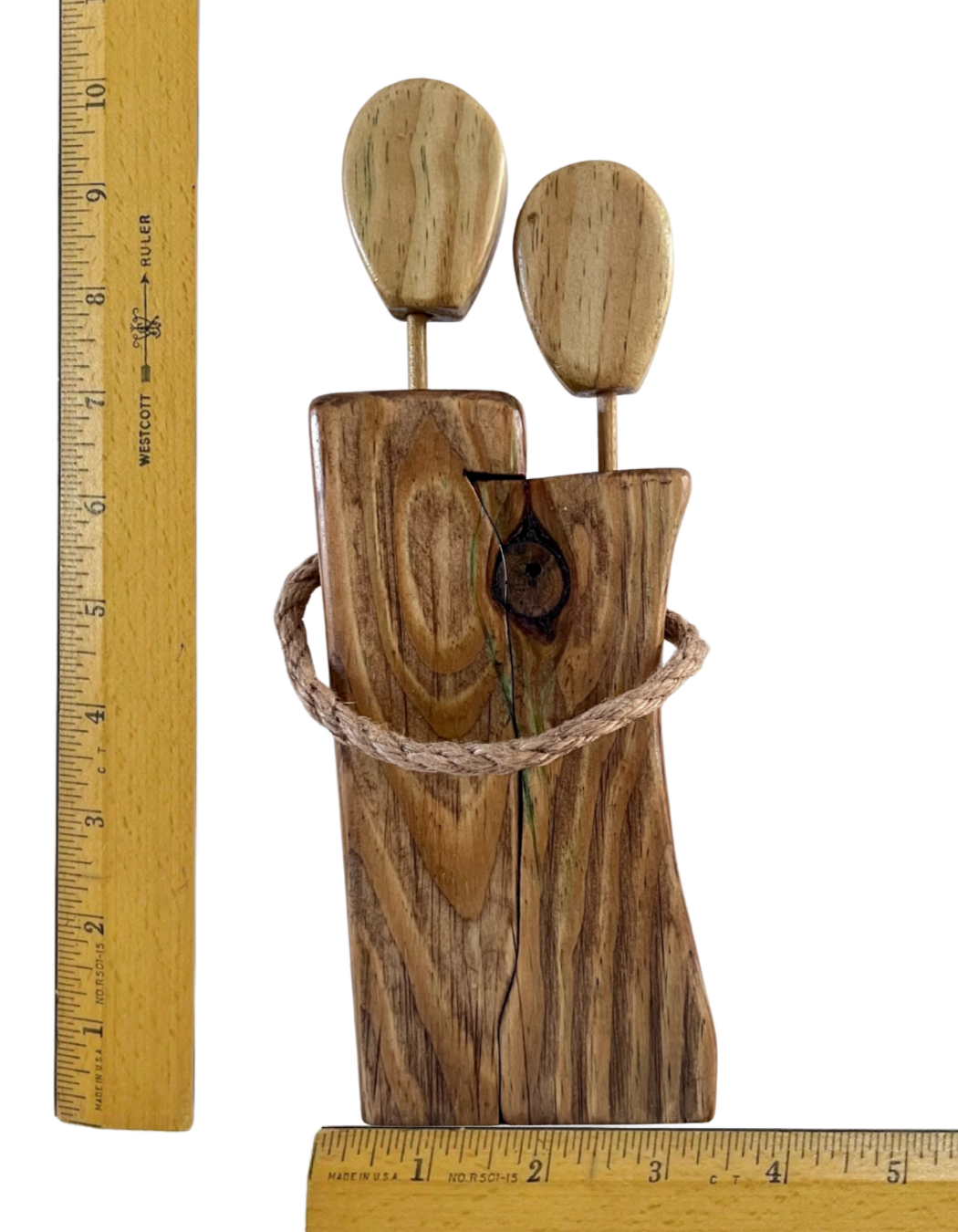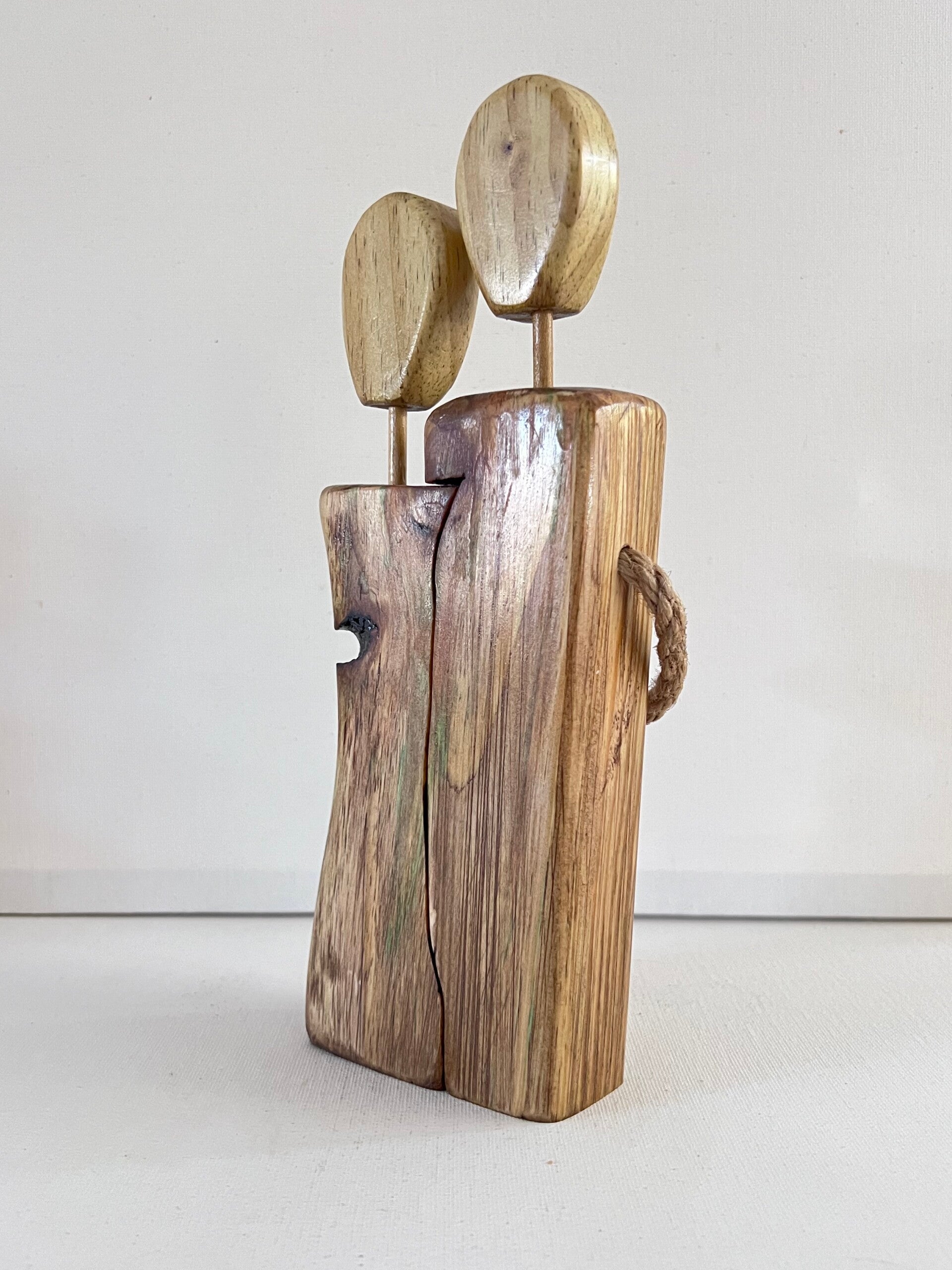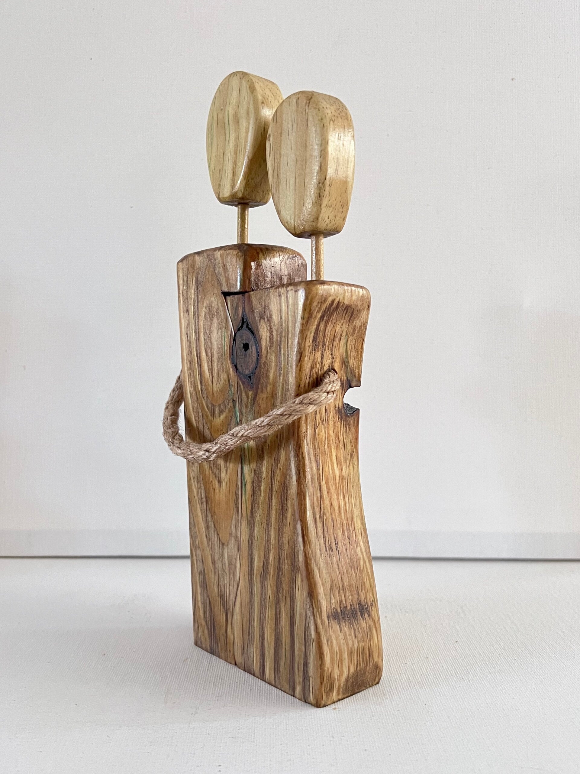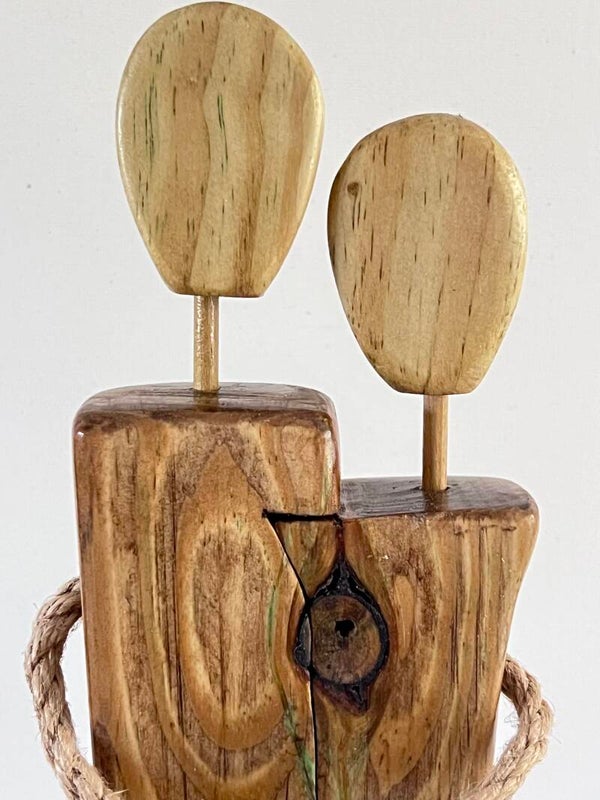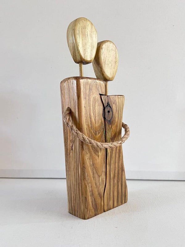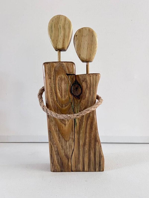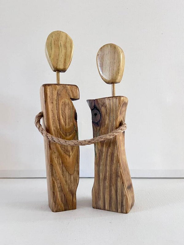 Celebrate love and connection with this rustic unity figrine. It features two natural wood figures in a loving embrace, showcasing unique grains and warm tones. The faceless heads symbolize universal love, while the braided rope represents their bond. This piece is a heartfelt gift for weddings or anniversaries, adding warmth to any home décor.